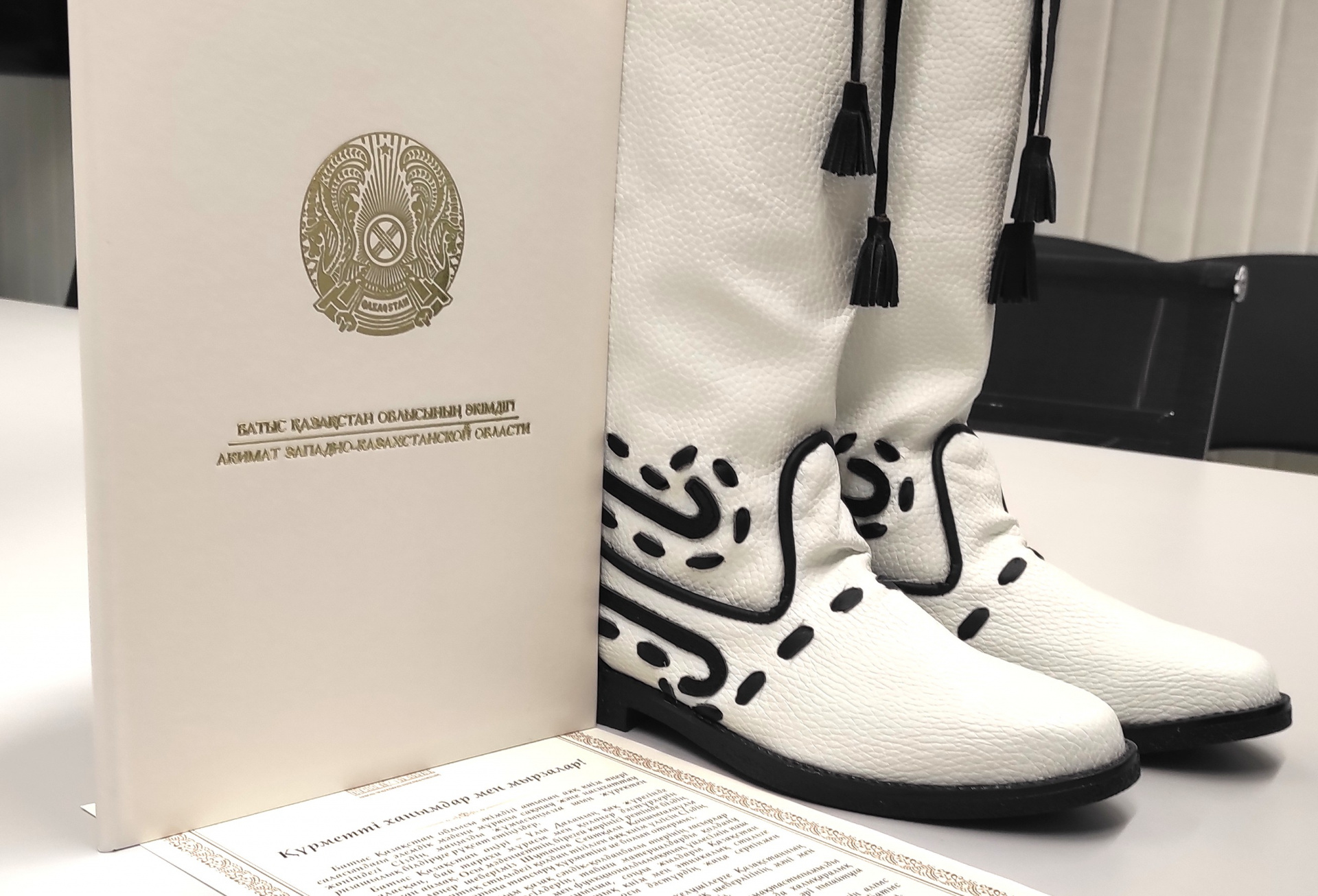 „Západní Kazachstán je region v samém srdci Velké stepi a vyznačuje se bohatým historickým odkazem a silnou tradicí lidových řemesel,“ píše se v něm. „V rámci této kulturní linie máme tu čest předat do sbírkového fondu Vašeho muzea exponát ručně šité obuvi v našem národním stylu.“ Bílé holínky z měkké kůže, zdobené černými ornamenty, byly zhotoveny pro zlínské muzeum kazašským mistrem řemeslné tvorby Sejtkaliem Kojšygaliuly Šutanovem. V dopise přiloženém k daru vyjádřil dále pan hejtman Turegaliyev přesvědčení, že nový exponát poskytne návštěvníkům muzea možnost seznámit se s bohatstvím kazašské kultury a ocenit hodnotu lidového řemesla a porozumět jeho estetickému i duchovnímu významu.