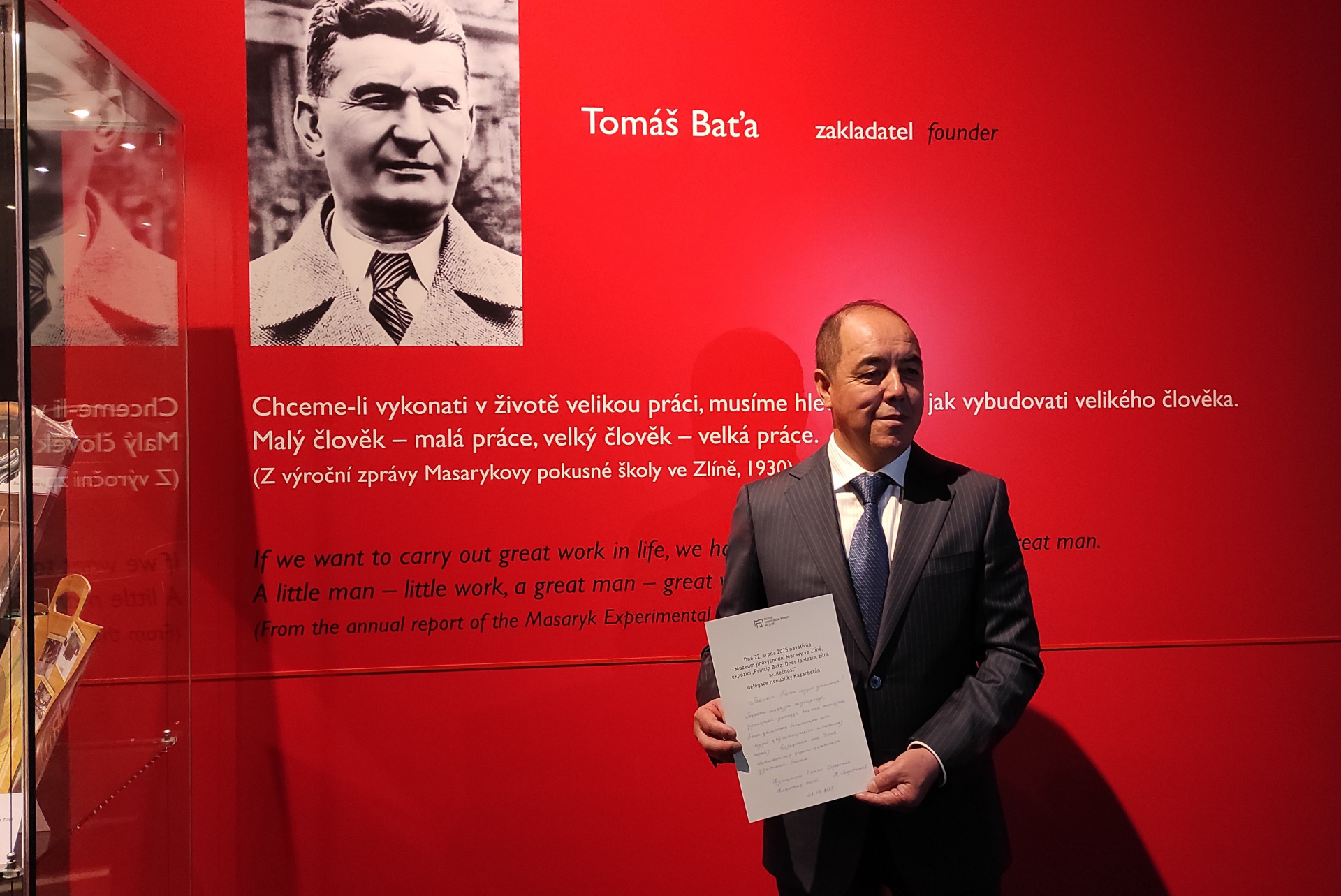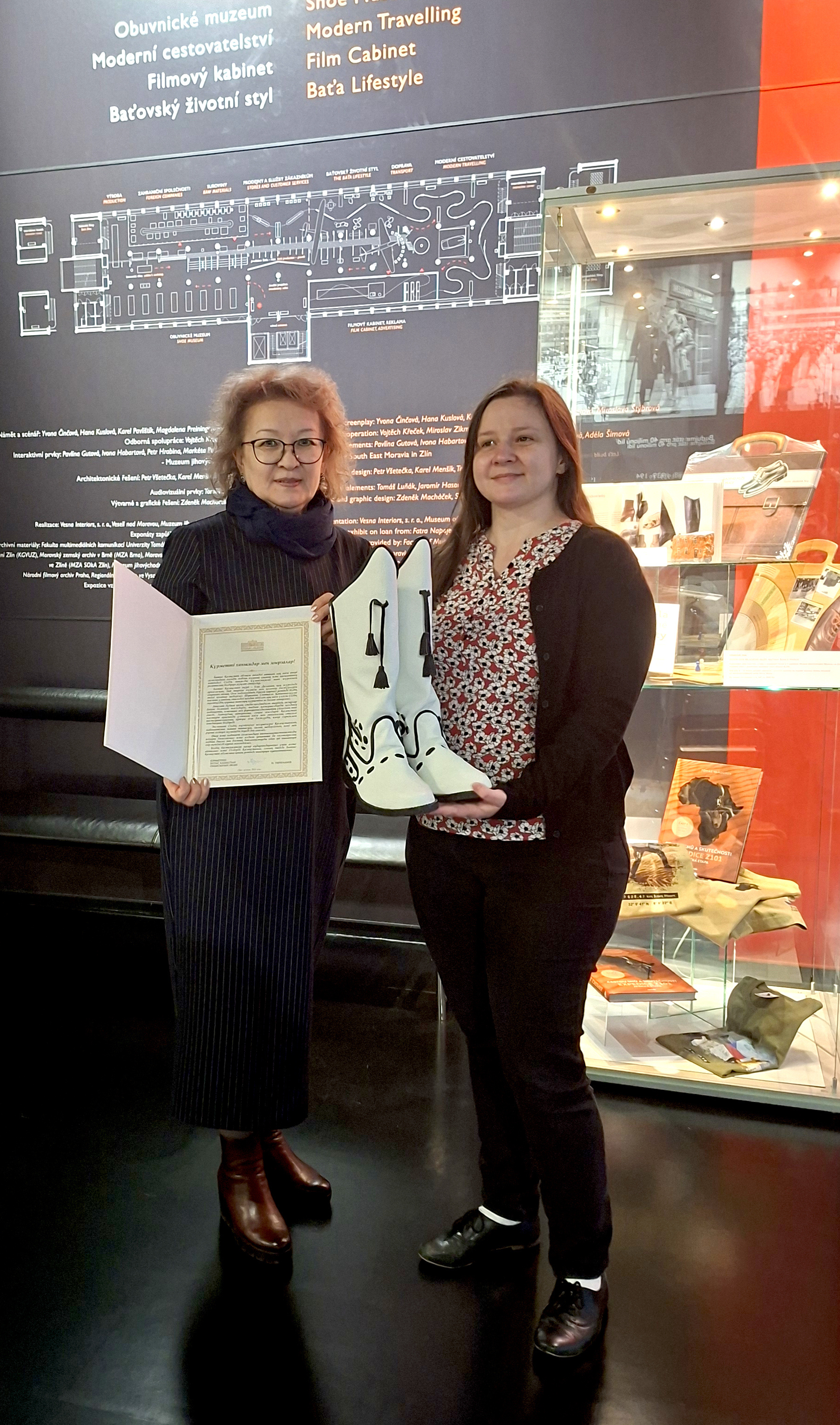 Podobně tomu bylo i v případě návštěvy delegace Kazašské republiky v srpnu tohoto roku. Hosté, včetně velvyslance v České republice Bakyta Dyussenbayeva a akima (hejtmana) Západokazašské oblasti Narimana Turegaliyeva, ocenili především vizionářské dílo Tomáše Bati, ale byla to právě část expozice s exotickou obuví, kde se zdrželi nejdéle. U několika exponátů ze střední Asie poukazovali na jejich podobnost s lidovým obutím své země a při informaci, že zlínské muzeum bohužel přímo z Kazašska žádnou obuv nemá, prohlásil pan hejtman Turegaliyev, že se postará o nápravu.