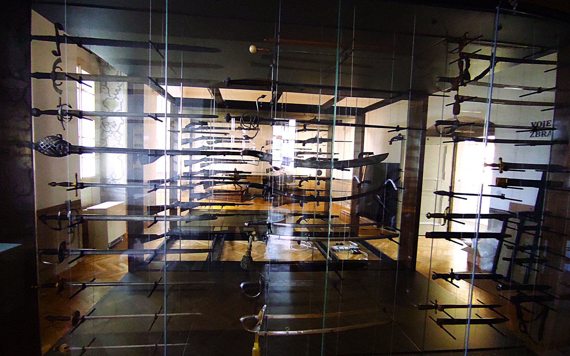 Vybraný soubor chladných zbraní dokumentuje jejich vývoj od meče k šavli přes palaše, kordy a rapíry. Palné zbraně jsou zastoupeny vojenskými a loveckými předovkami a zadovkami vyrobenými v 17.–19. století, a výběr zbraní ukazuje jejich postupné technické zdokonalování vedoucí k vyšší účinnosti. V souboru vojenských zadovek jsou vedle sebe vystaveny pro srovnání pušky stejných systémů, ale určené pro různé druhy vojsk. U loveckých pušek mohou návštěvníci obdivovat zdobení pažeb a zámkových desek. Přehlídku palných zbraní uzavírají kulomety Maxim a Colt-Browning používané československými legionáři v Rusku v bojích během první světové války.