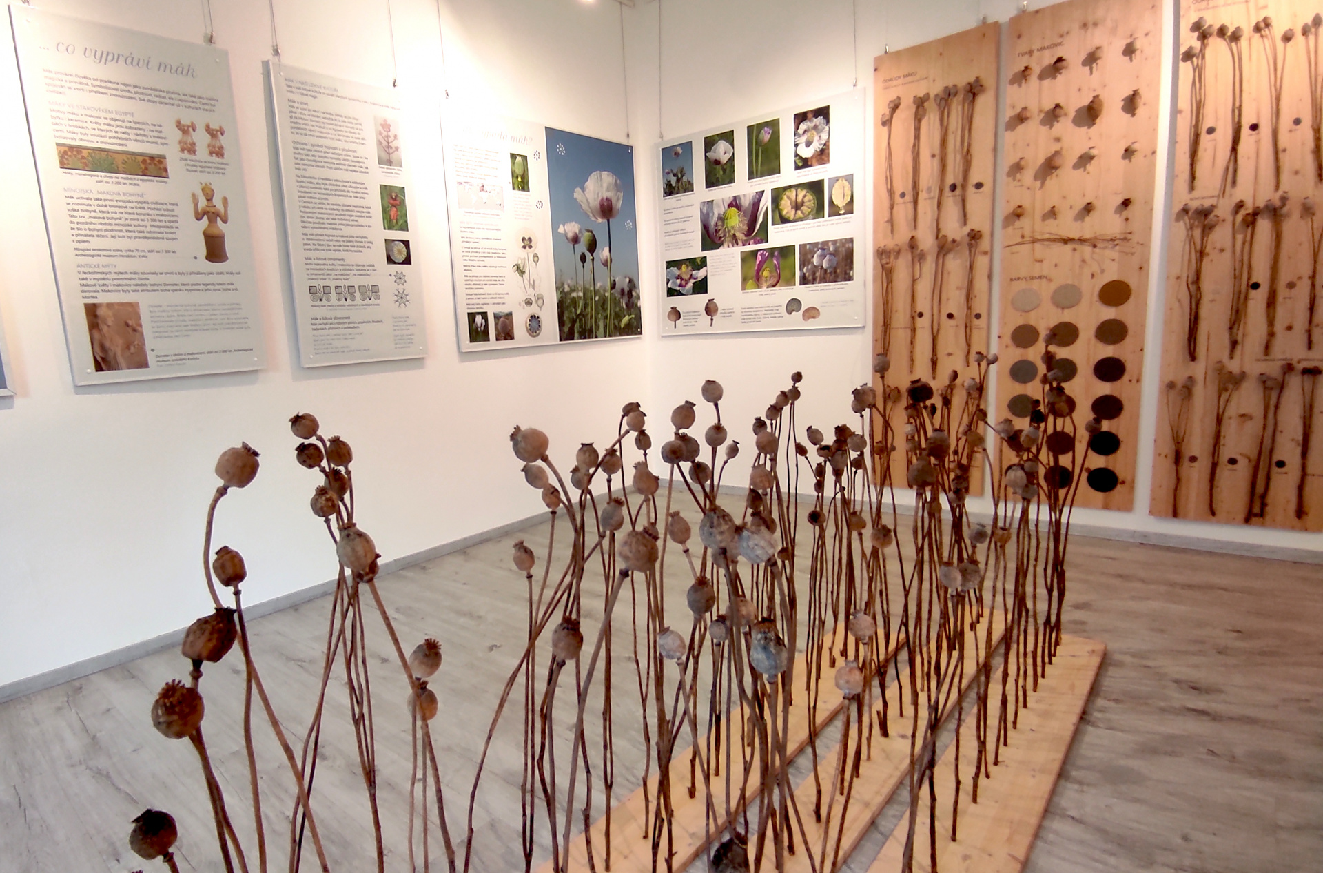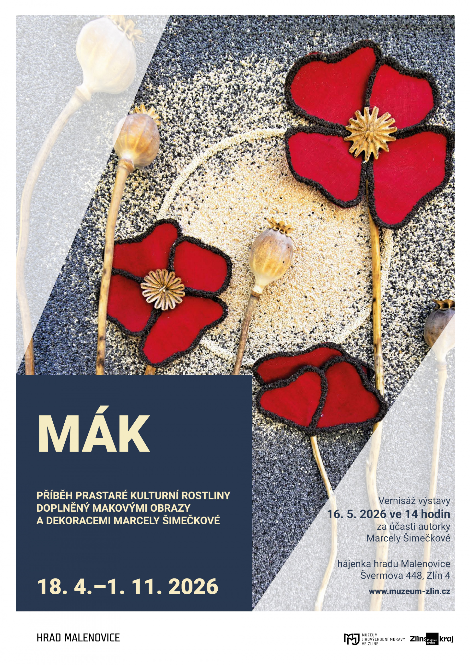 Výstava představuje mák jako starobylou kulturní rostlinu a věnuje se jeho odrůdám, pěstování i využití v minulosti i současnosti. Téma doplňují dekorace a obrazy výtvarnice Marcely Šimečkové zhotovené právě z máku. Ze sbírek muzea jsou vystaveny i trojrozměrné předměty, které upomínají na pěstování a zpracování máku v historii nebo na jeho využití v symbolice na dekoracích textilu a keramiky.